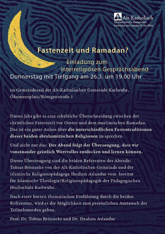 26.03.2026: "Fastenzeit und Ramadan?" Interreligöser Gesprächsabend mit Prof. Dr. Tobias Brönneke, Alt-Katholische Gemeinde Karlsruhe.