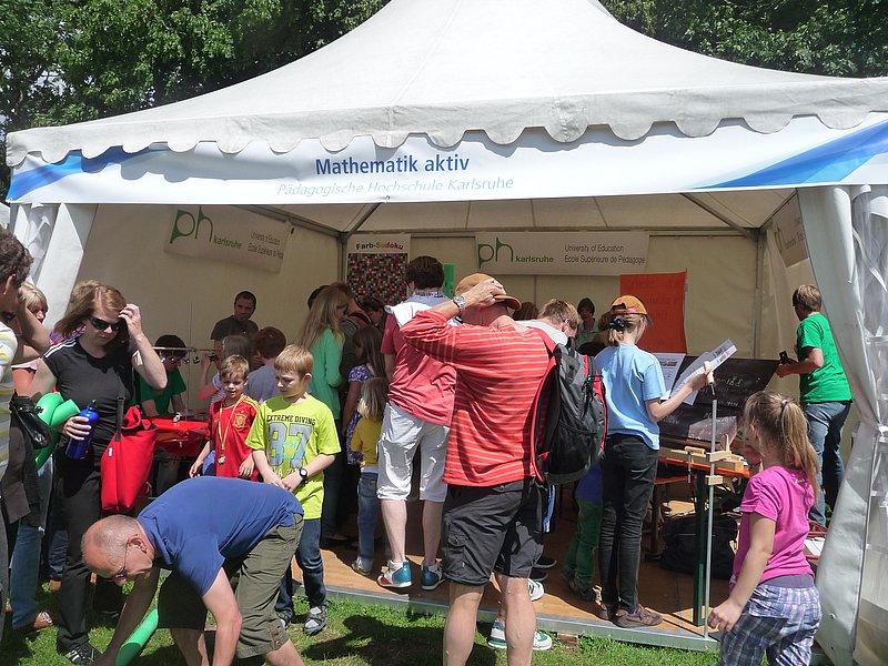 Im Jahr 2013 zog das KinderLabor des Instituts für Chemie das erste Mal im Rahmen von EFFEKTE in eines der Zelte im Experimentepark und wurde sofort zum Publikumsmagneten für Groß und Klein. Seitdem ist das Zelt mit den vielen Kindern in Laborkitteln und mit Schutzbrillen vom Gelände des Wissenschaftsfestivals am Sonntag des Abschlusswochenendes nicht mehr wegzudenken. Und es folgten viele weitere erfolgreiche Aktivitäten der Pädagogischen Hochschule Karlsruhe in die Zelte, die es sich alle zum Ziel gesetzt haben auf unterhaltsame, spannende und verständliche Weise Themen aus der Mathematik, der Informatik, der Naturwissenschaften und der Technik ihren jungen Besucherinnen und Besuchern näher zu bringen. So auch im Jubiläumsjahr 2023 am Sonntag, den 25. Juni: Im „Mathekosmos zum Anfassen“ laden Dr. Thomas Borys und seine Studierenden ein zum Sonnenuhren Basteln, der Entdeckung mathematischer Muster, Zahlen in Steine zu ritzen wie im alten Rom und nicht zuletzt der Verschlüsselung geheimer Botschaften. Ein Zelt weiter findet sich das gemeinsame Lehr-Lern-Labor Informatik von PHKA und KIT. Hier können Denkweisen der Informatik hautnah erfahren werden. In verschiedenen Programmier-Challenges können Schülerinnen und Schüler interaktiv erleben, was Algorithmen bewirken und in die faszinierende Welt der Programmierung einsteigen. Und in einem Doppelzelt präsentiert sich das Lehr-Lern-Labor „Kinder experimentieren“: An Stationen zu den Themen LUFT, WASSER, ENERGIE, KOHLENSTOFFDIOXID, FARBEN, FEUER können Kinder unter Anleitung von Dr. Wolfgang Schmitz und PHKA-Studierenden wichtigen Fragen nachgehen wie „Was benötigt eine Flamme, um zu brennen? Wie können Gummibärchen tauchen, ohne nass zu werden? Und woraus besteht eigentlich Brausegas?“ und so Elementares aus der Chemie erfahren.